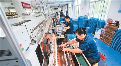 八月十五日,在山东省青州市王府街道一家电子元器件制造企业车间,工人在进行组装作业。王继林摄(人民视觉)