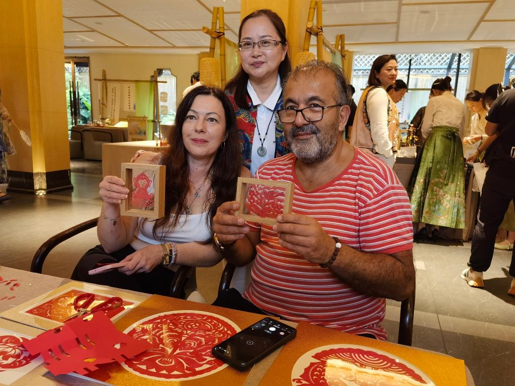 土耳其游客塞拉莱丁·卡尔塔尔入住酒店时就被这项活动吸引。他驻足上海剪纸摊位,向非遗传承人询问不同图样的意义。