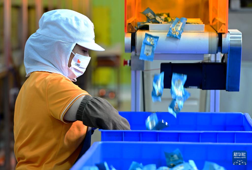 在福建八马茶业安溪总工厂的第六代铁观音智能化精制生产线上,一名工人在收整下线的铁观音成品茶(2024年5月8日摄)。 新华社记者 魏培全 摄