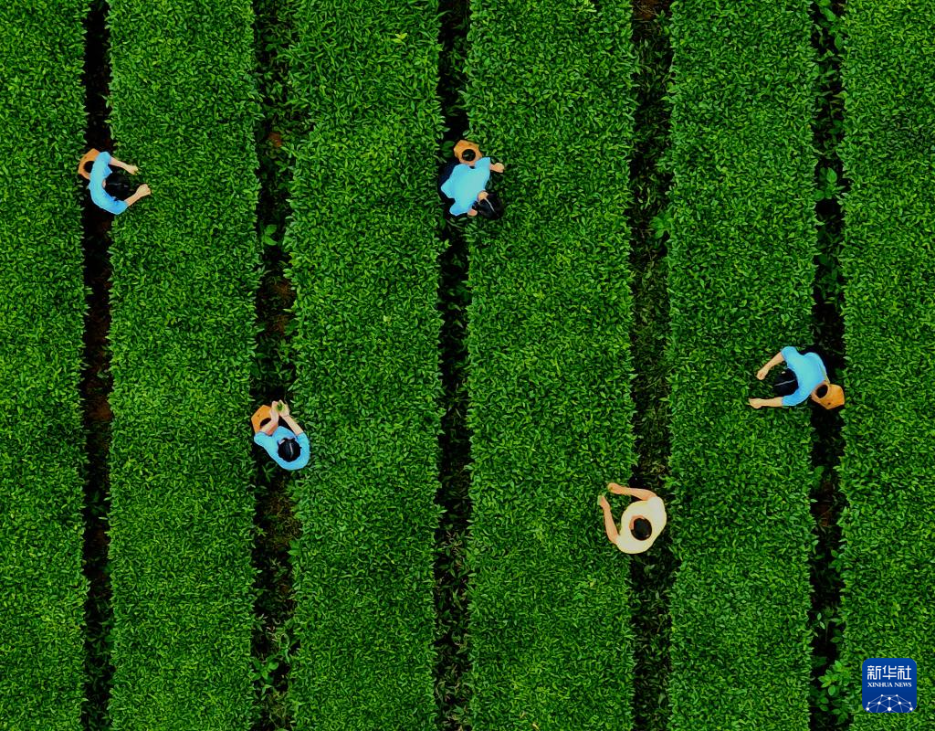 在安溪县西坪镇珠洋村八马红星茶场,茶农在茶园里采收茶叶(2024年5月9日摄,无人机照片)。 新华社记者 魏培全 摄
