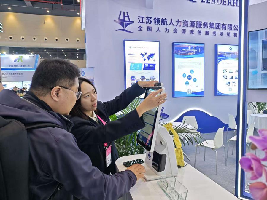 “我们这款设备,已经在江苏省南京市江北新区顶山街道落地使用。”在江苏领航人力资源服务集团有限公司的展台,多位参会代表走到一台名为“家门口就业服务站”的智能终端前,驻足观看设备演示。