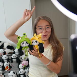 2025年8月10日,在位于成都市武侯区的四川熊猫滚滚科技有限公司直播间,主播在某电商平台直播销售“大熊猫IP”包挂产品,据统计,今年1-7月,该公司包挂产品销售额达到1200万元。新华社发(翁光建 摄)