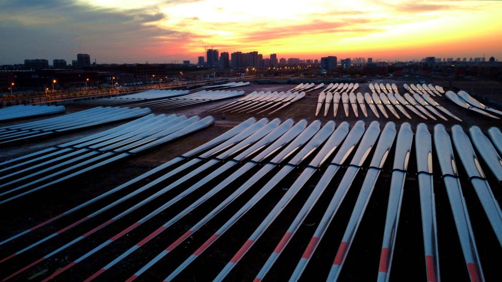 山东省滨州市惠民县风电装备制造产业园叶片堆场(2025年11月19日摄,无人机照片)。新华社记者 郭绪雷 摄