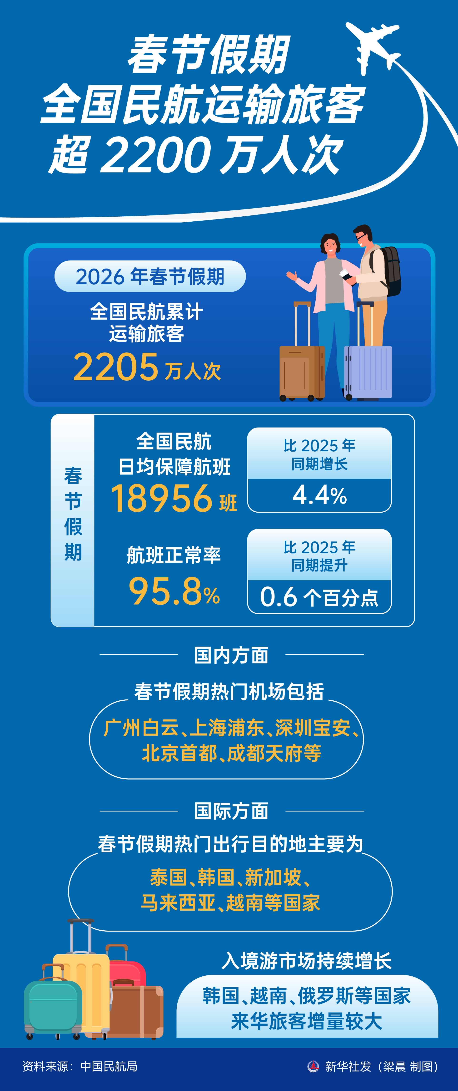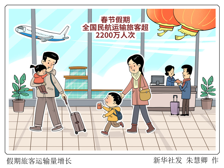 数据显示,春节假期全国民航日均保障航班18956班,比2025年同期增长4.4%。航班正常率95.8%,比2025年同期提升0.6个百分点。