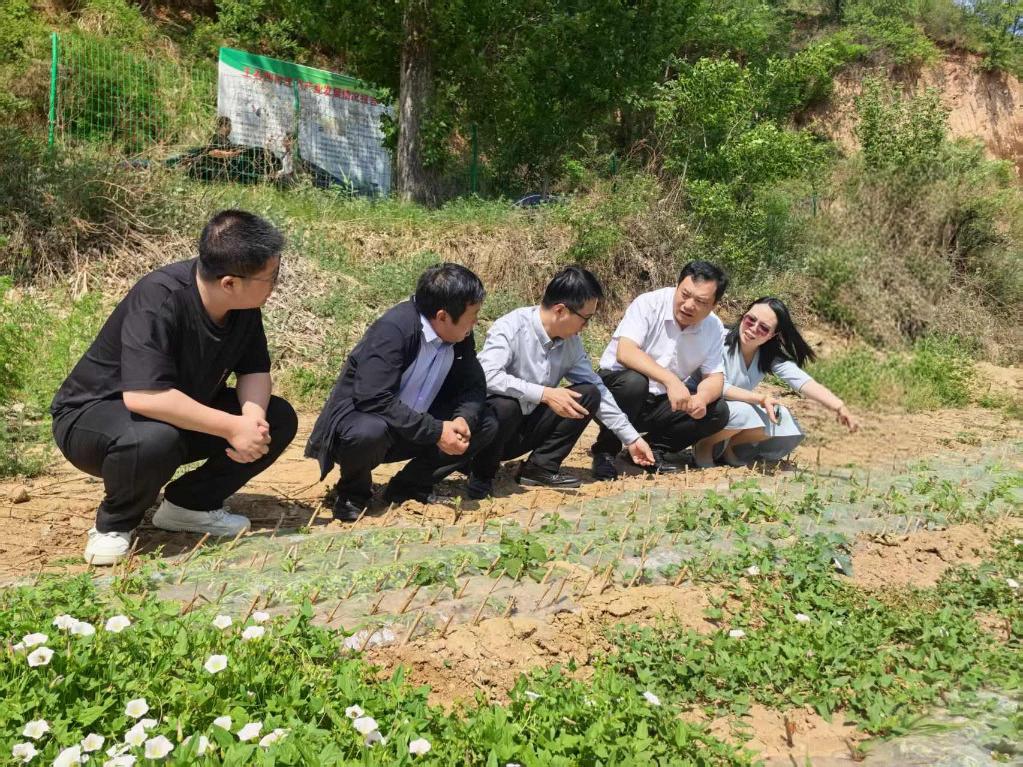 2025年5月,姜兴健(右三)陪同陕西科技大学连翘育种专家团队调研育种基地。(受访者供图)