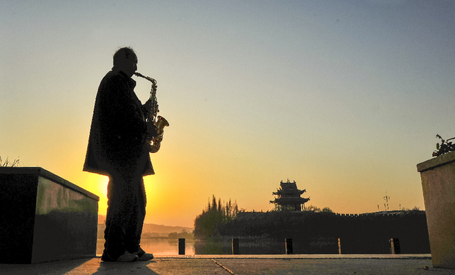 2013年12月31日,湖北襄阳,护城河边练习乐器的老人。视觉中国