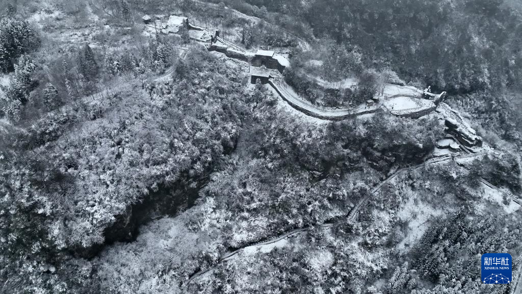 12月27日在贵州省遵义市海龙屯景区拍摄的雪景(无人机照片)。