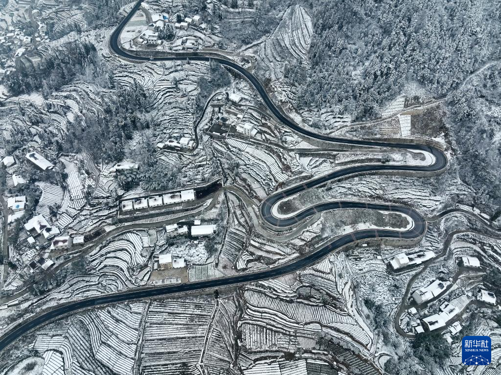 12月28日拍摄的贵州省丹寨县龙泉镇高要村雪后苗寨梯田景色(无人机照片)。