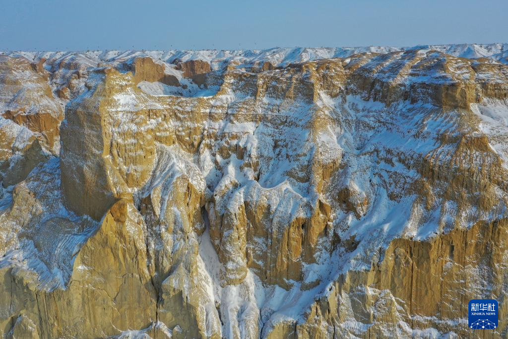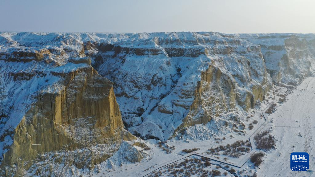 海上魔鬼城景区位于新疆阿勒泰地区福海县吉力湖东岸。冬日的海上魔鬼城银装素裹,错落有致的山体与皑皑白雪构成一幅壮丽的画卷。