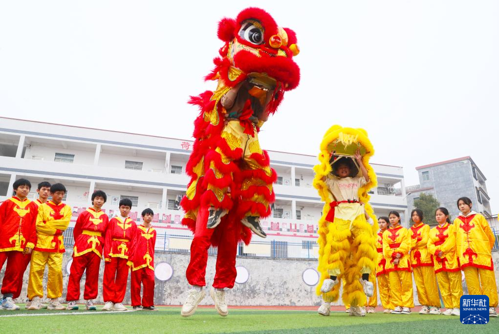 1月15日,湖南省永州市新田县莲花学校学生在老师指导下练习舞狮。