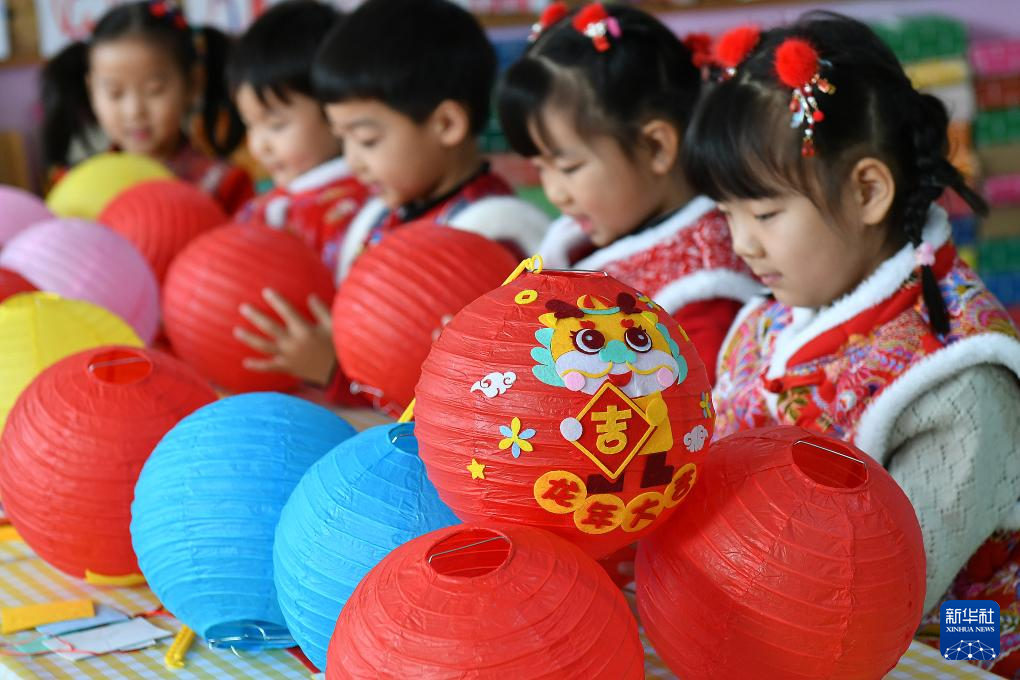 1月16日,山东省烟台市福山区清洋街道中心幼儿园的小朋友在制作灯笼。