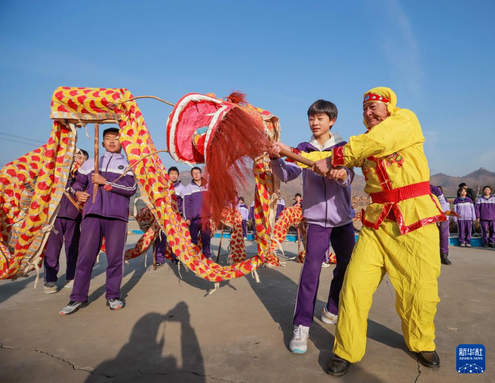 1月16日,在河北省遵化市小厂乡洪山口九年一贯制学校,民间艺人向学生传授舞龙技能。