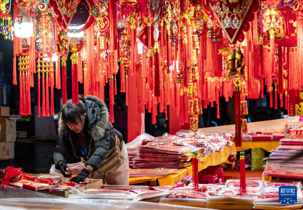 商户在昆明翠湖年货街上整理节庆饰品(1月16日摄)。