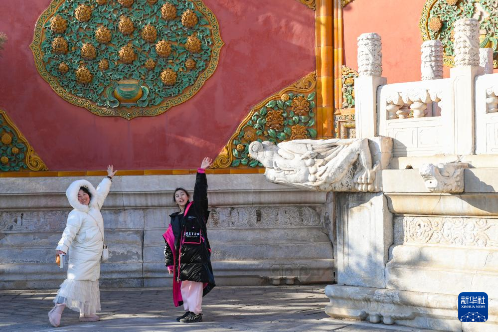 游客在故宫的一处“蚣蝮”造型排水口旁留影(1月28日摄)。在神话传说中,蚣蝮是龙生的九子之一。