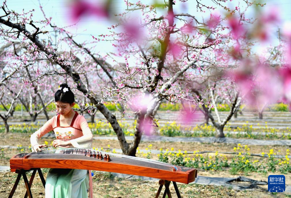 4月5日,深州市第三中学学生在蜜桃观光园内练习古筝。