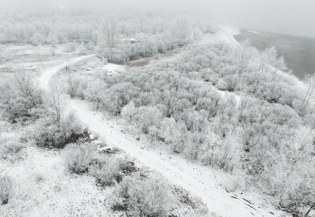 这是11月14日在莫力达瓦达斡尔族自治旗拍摄的雾凇景观(无人机照片)。