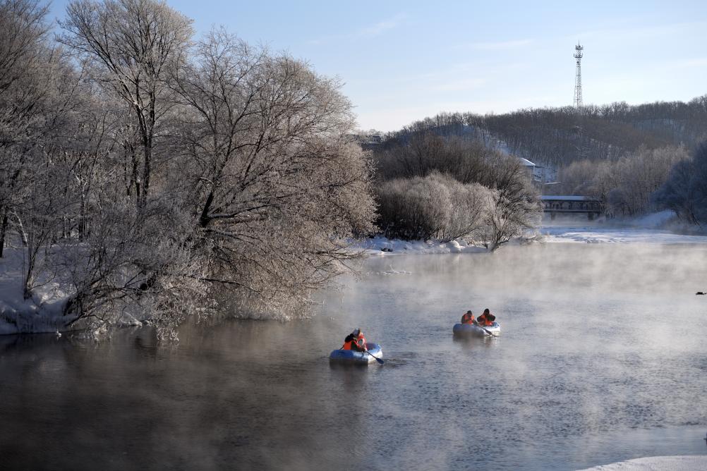 冬日,黑龙江省五大连池市山口湖景区出现雾凇景观,游客一边体验漂流,一边欣赏雾凇美景。