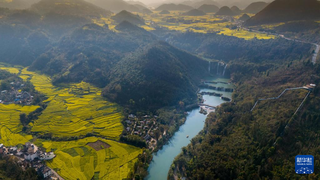 春日里,在云南省曲靖市罗平九龙瀑布群风景区,湖光山色美不胜收,吸引众多游客。