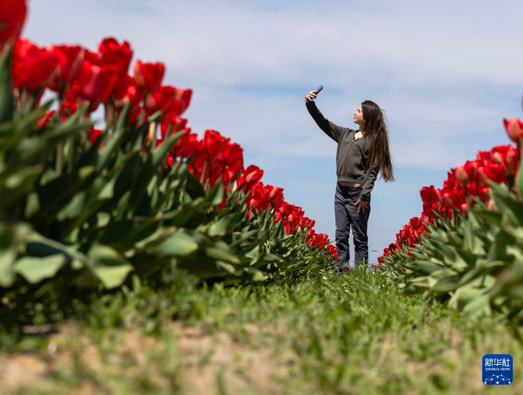 4月30日,一名女子在加拿大安大略省滨湖尼亚加拉镇一处农场的郁金香花田中自拍。
