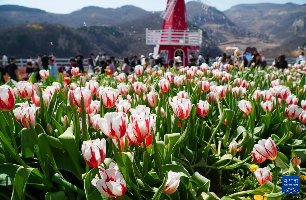 近日,山东省淄博市博山区红叶柿岩景区的郁金香陆续盛开,吸引游客前来赏花踏春。