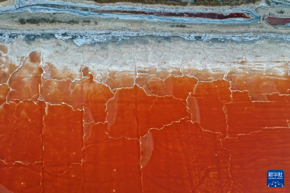 连日来,随着气温持续升高,位于山西南部的运城盐湖呈现出色彩斑斓的景象,从空中俯瞰,如同一块块散落在大地上的调色盘。