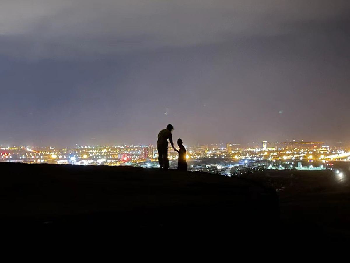 独山子区夜景尽入眼帘,笔者还拍到一对少数民族男女的背影。(作者供图)