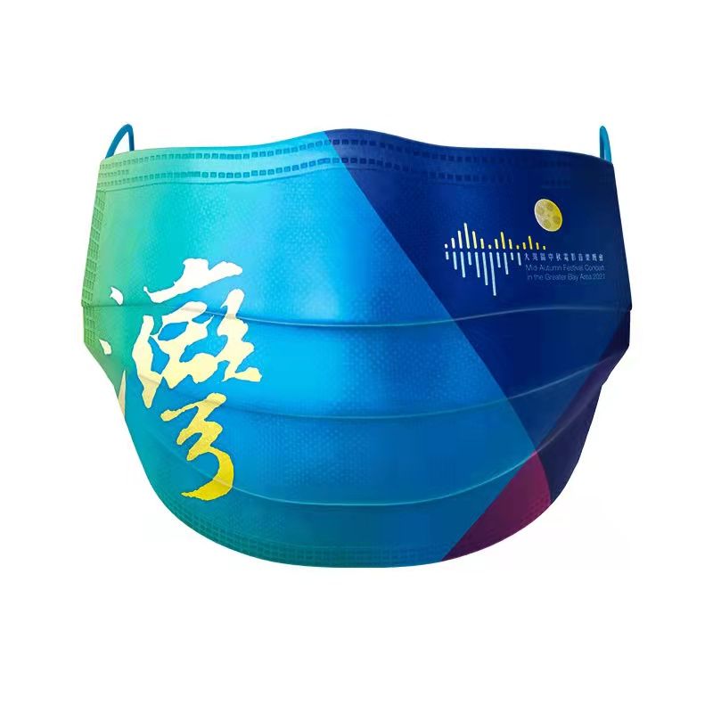 值得关注的是,这款口罩以一个颇具艺术感的黄色“湾”字首先吸引着人们的目光,“湾”字既代表大湾区,也暗合了晚会的主题曲《湾》。除了“湾”字以外,口罩上用了三种深浅不一的蓝色点染,三种蓝色汇合在一起,又如“粤港澳”大湾区三地的海水始终交融在一起。而黄色“湾”字则正如一轮月亮升起在“粤港澳”,大湾区始终共享同一个月亮。