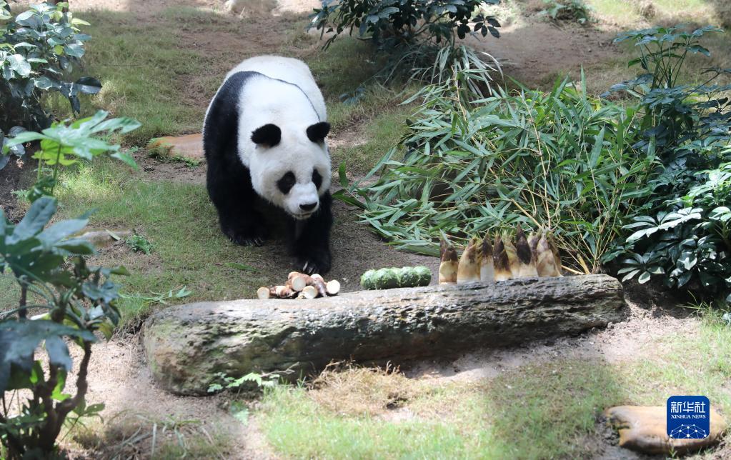 在香港海洋公园,大熊猫“安安”走向美食(2020年5月11日摄)。新华社记者 吴晓初 摄