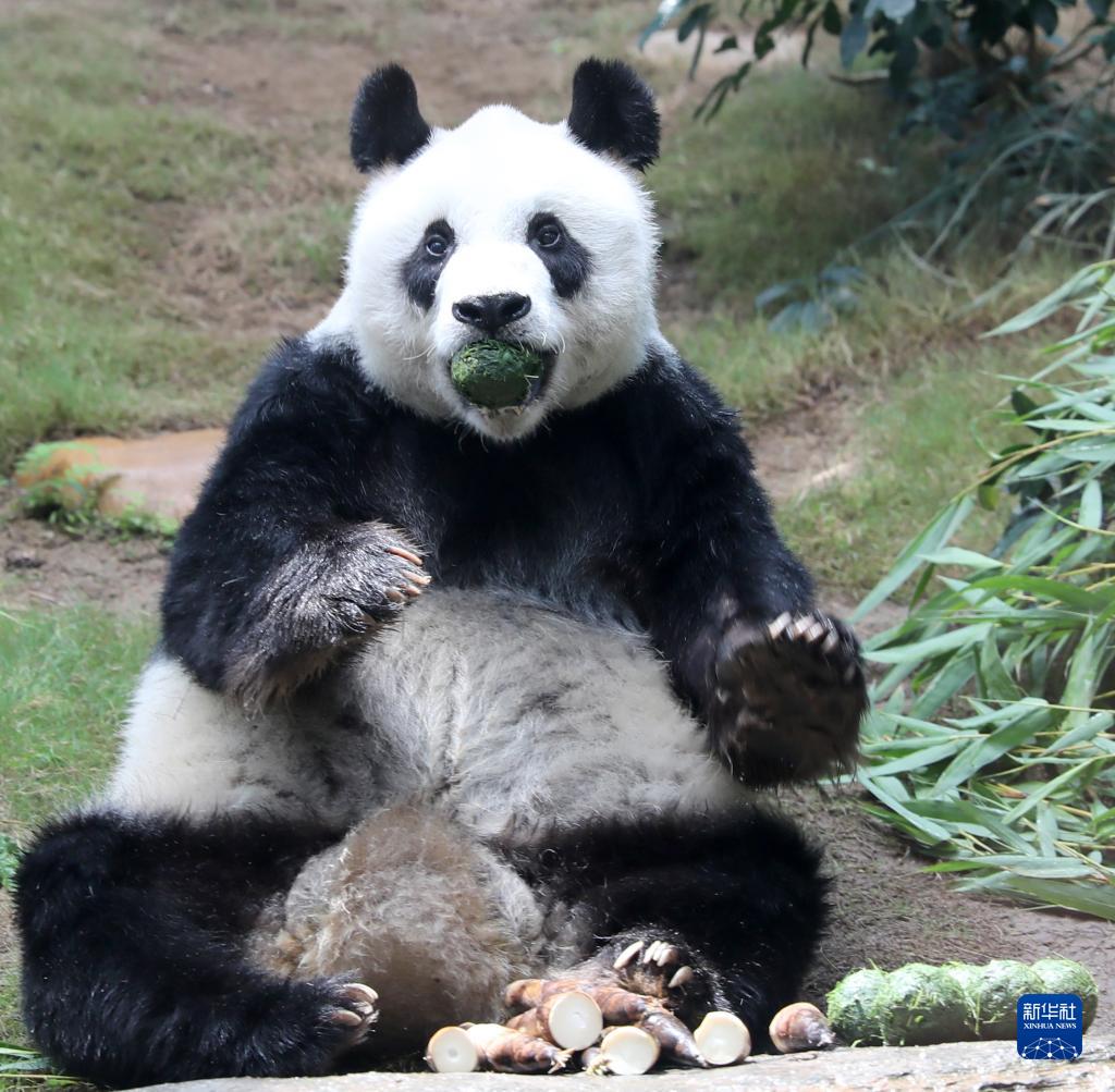 在香港海洋公园,大熊猫“安安”坐在小山坡上吃竹叶团(2020年5月11日摄)。新华社记者 吴晓初 摄