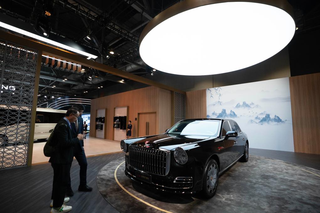 6月12日,市民在2025国际汽车及供应链博览会(香港)参观红旗汽车。新华社发(吕小炜摄)