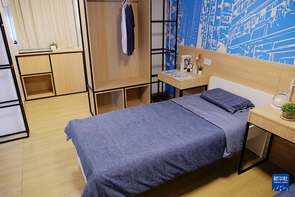闲置已久的启德方舱已焕然一新,变身青年驿站和青年创业孵化基地。昔日的隔离房间已被巧妙改造成时尚宿舍,室内明亮,且均配备独立卫浴和电视。一人单位面积约18平方米,摆放了一张床和饭桌后,仍有不小走动空间;双人单位约36平方米,室内摆放了一张碌架床,客厅宽敞。