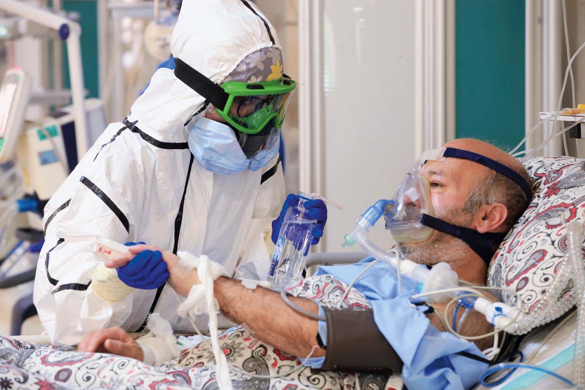 医务人员在伊朗德黑兰的一所医院照看新冠患者