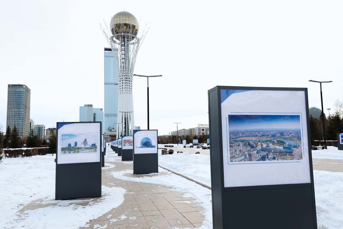 2021年12月16日在哈萨克斯坦首都努尔苏丹标志性建筑巴伊杰列克观景塔前拍摄的国家独立30周年图片展