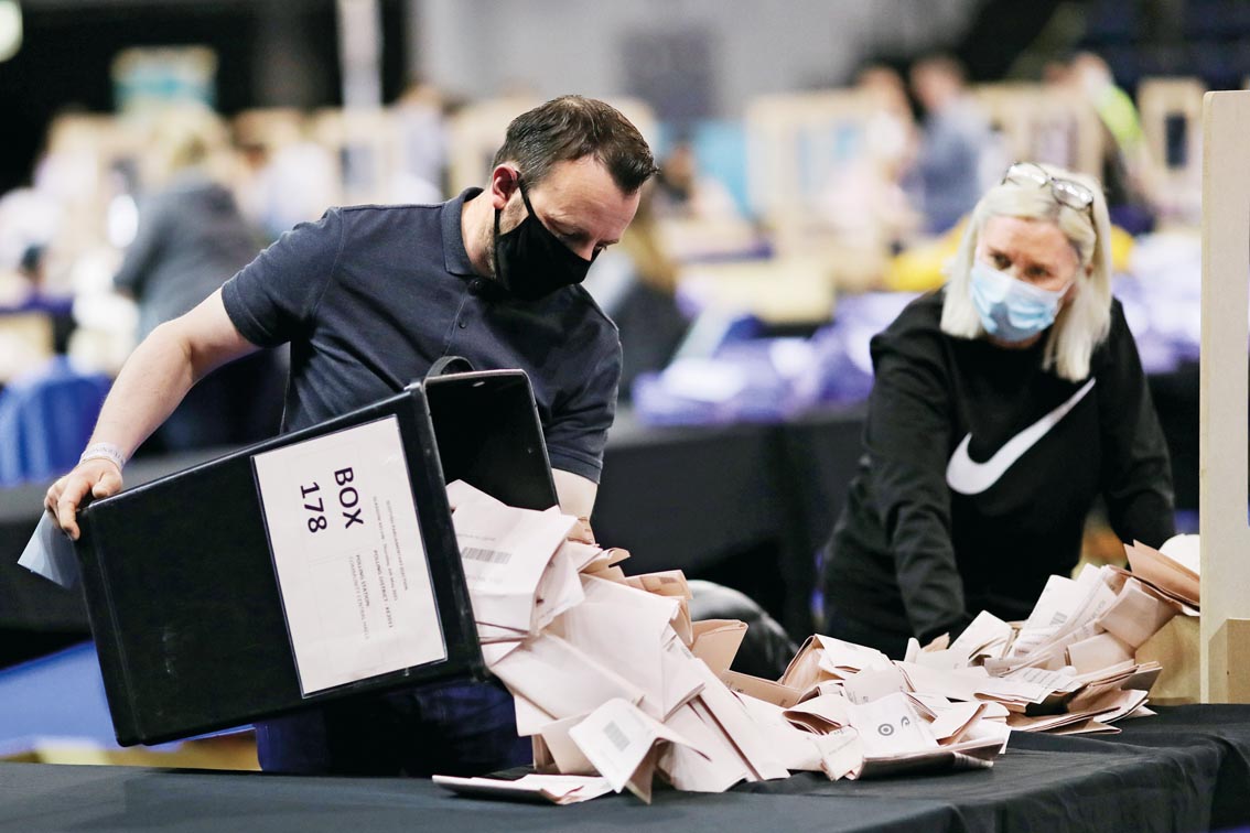 2021年5月8日,在英国苏格兰格拉斯哥的一个计票中心,工作人员清点选票