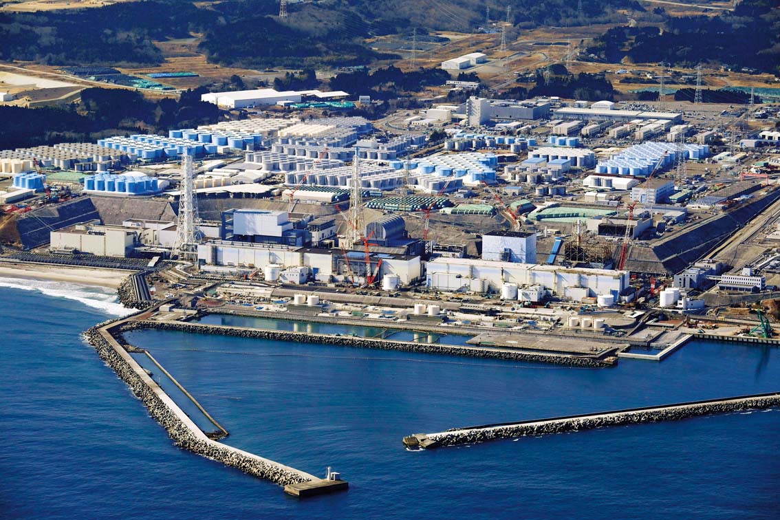 这张共同社提供的照片显示的是2021年2月13日拍摄的日本福岛第一核电站和核污水储水罐