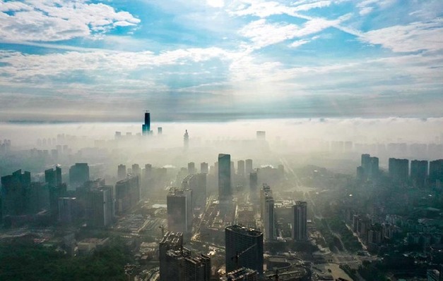 2021年5月8日,贵阳市观山湖区的高楼被雾气笼罩(无人机照片)