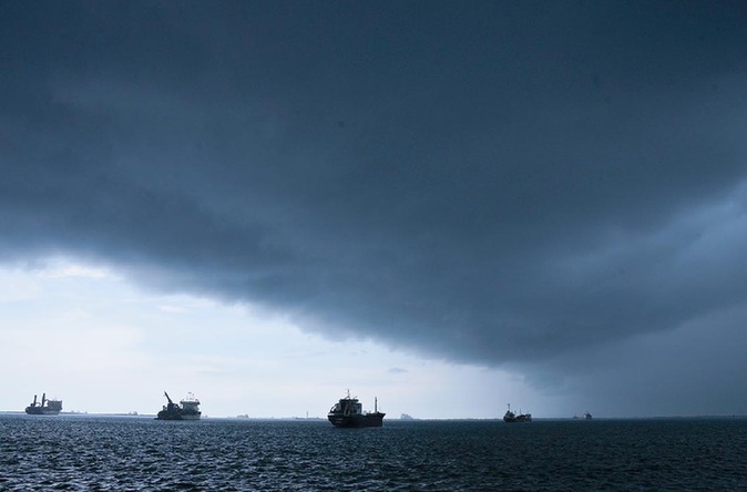 2023年9月4日,轮船停泊在巴拿马科隆附近海面等待通过巴拿马运河