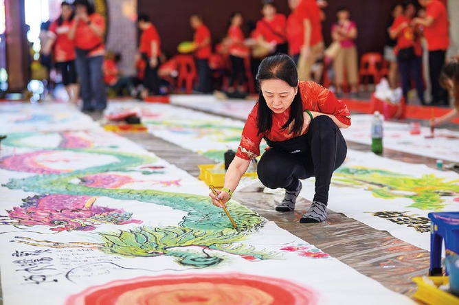 图为1月28日,在马来西亚雪兰莪州巴生,学员在长卷上创作