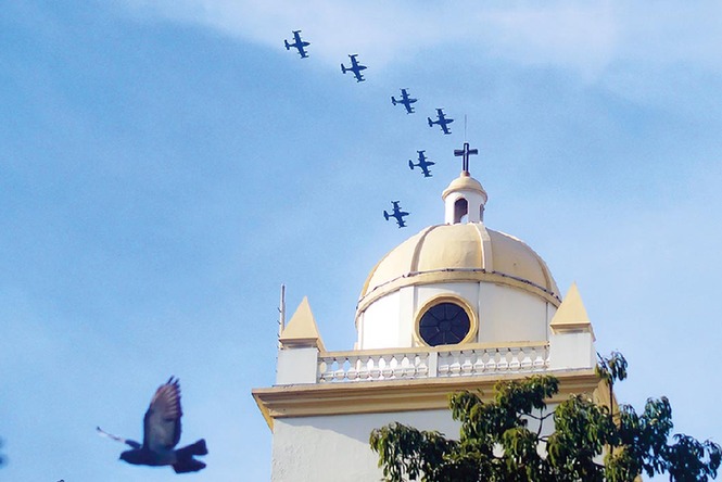 2021年9月15日,萨尔瓦多庆祝独立200周年。图为当天飞机编队在萨尔瓦多首都圣萨尔瓦多参加庆祝仪式