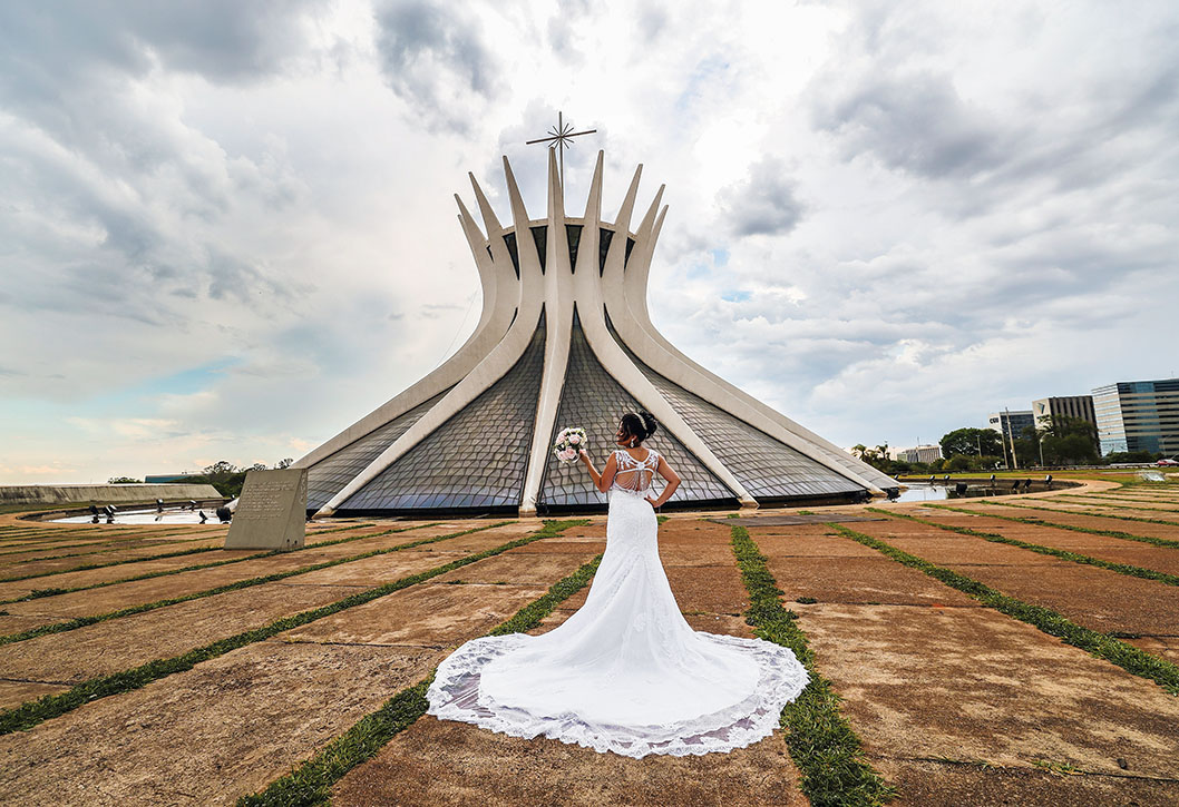 2019年11月2日,一名新娘在巴西首都巴西利亚大教堂前拍摄婚纱照