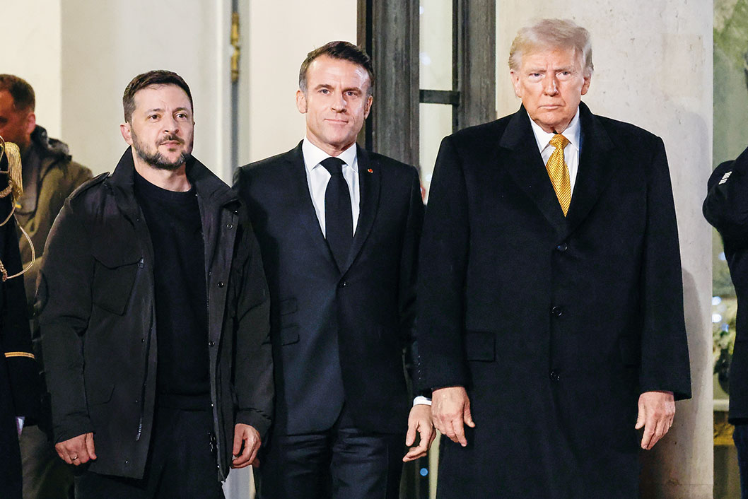 2024年12月7日,法国总统马克龙(中)与美国当选总统特朗普(右)和乌克兰总统泽连斯基会晤后走出爱丽舍宫