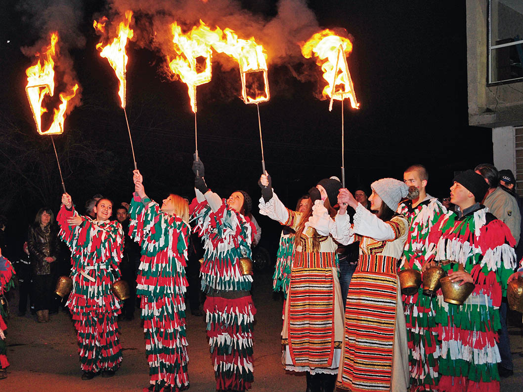 每当保加利亚旧历新年除夕,夜幕降临时,人们聚集到村镇的中心广场,燃起篝火。戴着面具的表演者与观看的人群嬉戏打闹,各种花式表演,最后活动进入高潮,人们手拉手跳起传统的圆圈舞,狂欢到深夜。