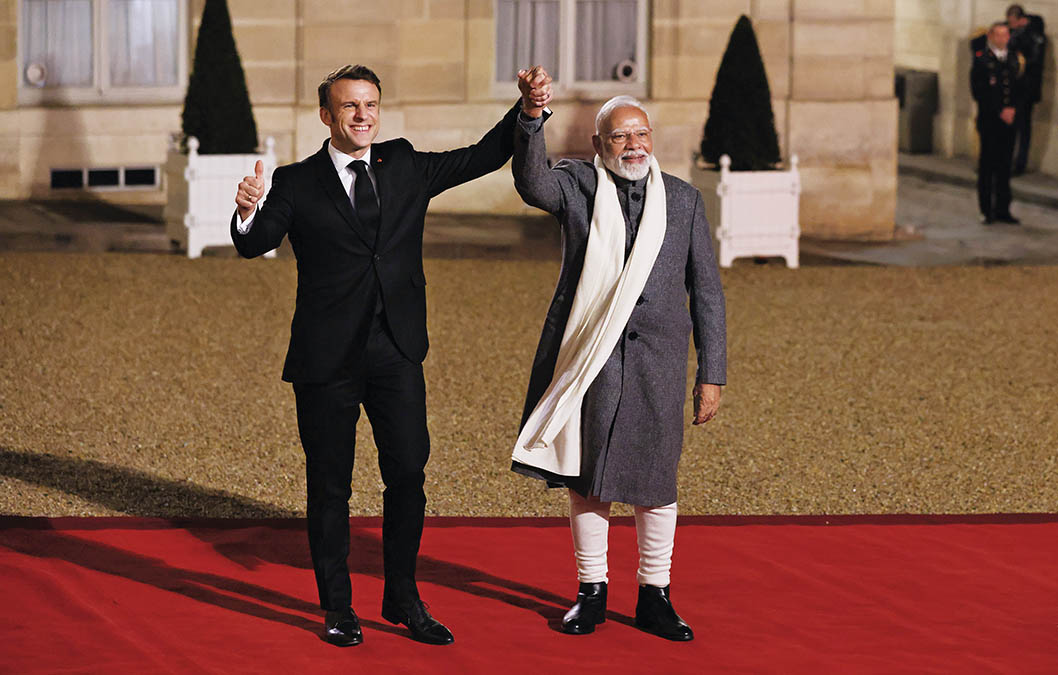 2月10日,人工智能行动峰会在法国首都巴黎的大皇宫拉开帷幕。图为在法国巴黎总统府爱丽舍宫,法国总统马克龙(左)与印度总理莫迪准备出席欢迎晚宴