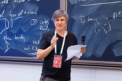 在首届国际基础科学大会期间,菲尔兹奖得主、法国科学院院士、法国高等科学研究所教授马克西姆·孔采维奇在北京雁栖湖应用数学研究院为与会学者和师生们作专题报告(2023年7月19日摄)