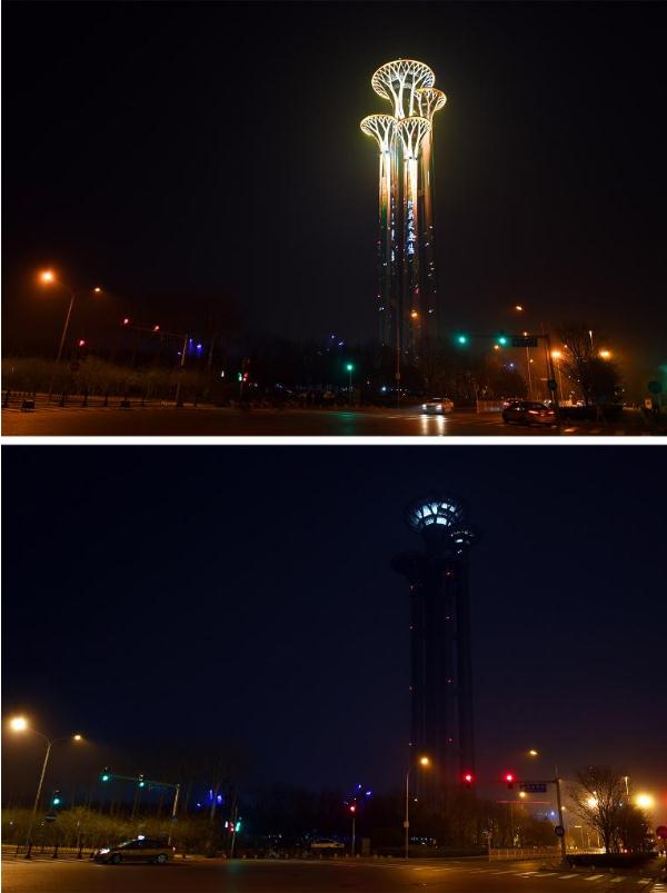 这是一张拼版照片:3月27日拍摄的熄灯前后的北京奥林匹克塔等建筑的对比。 3月27日晚,各地多处建筑参与“地球一小时”环保活动。“地球一小时”活动号召个人、社区、企业和政府在指定的一个小时内关闭不必要的电源,表明对应对气候变化行动的支持。 新华社记者 任超 摄