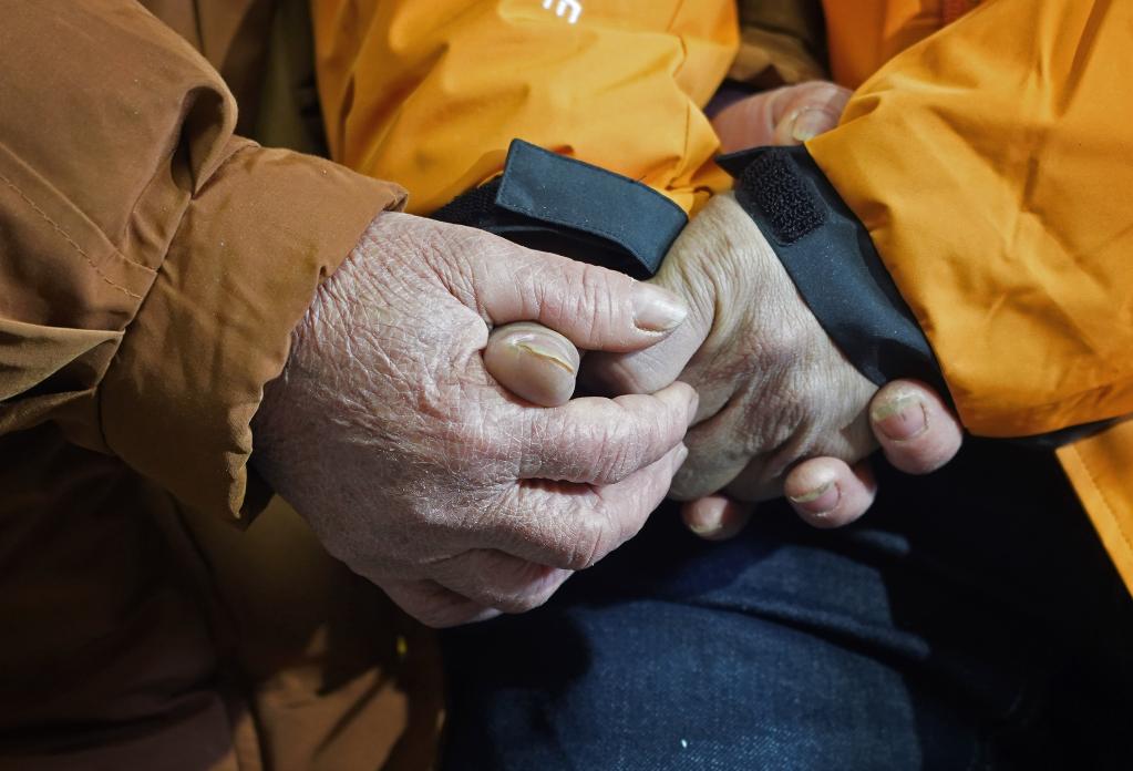 在靖安县黄龙村,从见到钱芳勇那一刻起,母亲余陈妹一直拉着儿子的手(1月30日摄)。