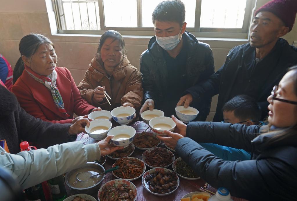 在靖安县黄龙村食堂,钱芳勇一家人与亲属和村民一起吃团圆饭(1月30日摄)。
