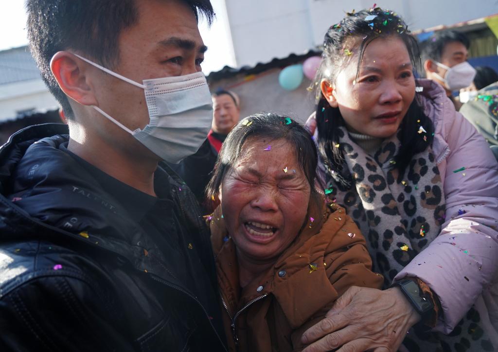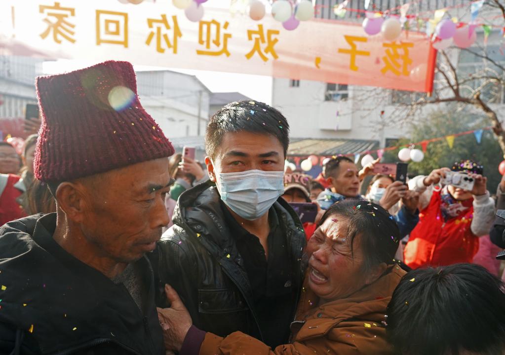 在靖安县黄龙村,母亲余陈妹(中)与儿子相拥而泣(1月30日摄)。