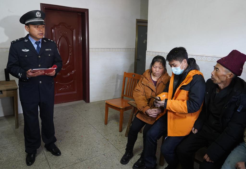 在靖安县黄龙村,靖安县公安局民警(左一)为钱芳勇一家人宣读司法鉴定书(1月30日摄)。