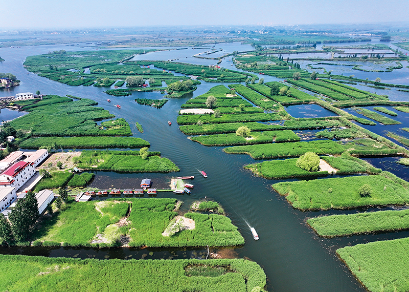 河北雄安新区白洋淀内天蓝水清、芦苇鲜绿,游船往来穿梭,构成一幅“城淀相依、共生共融”的美丽画卷。图为游船在雄安新区白洋淀内行驶(2024年5月8日摄) 牟宇摄/本刊